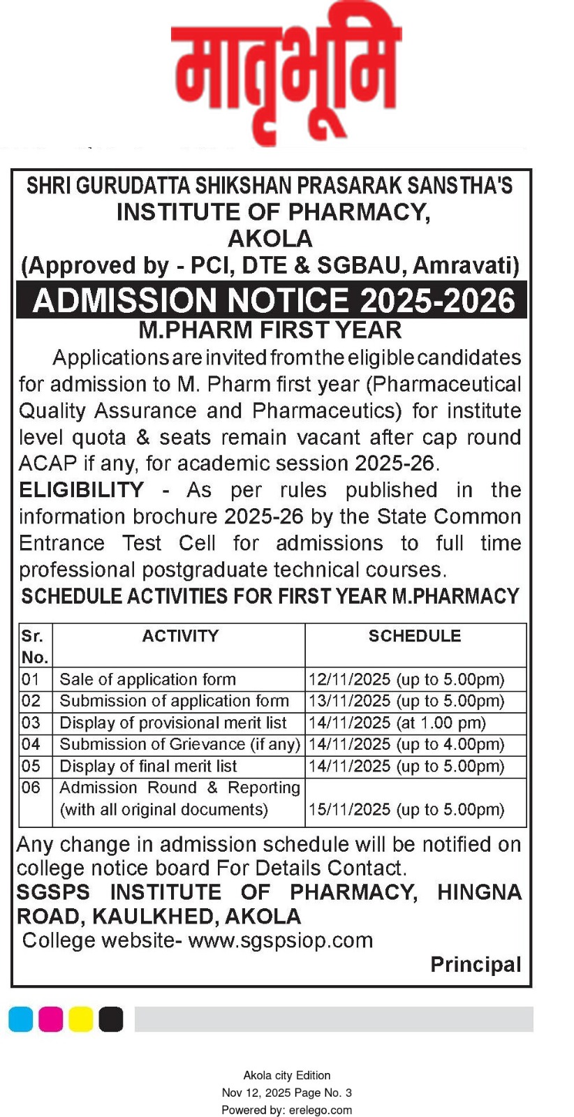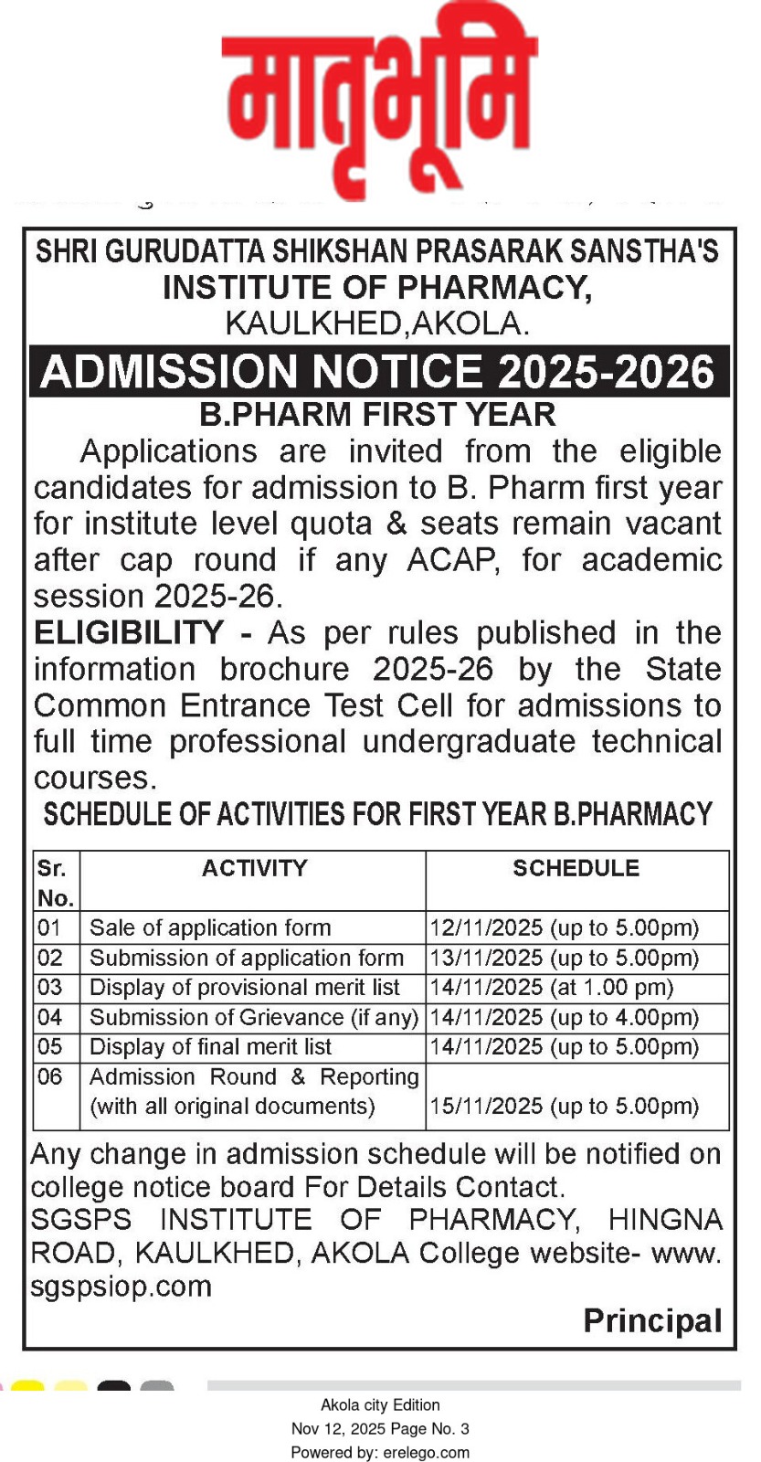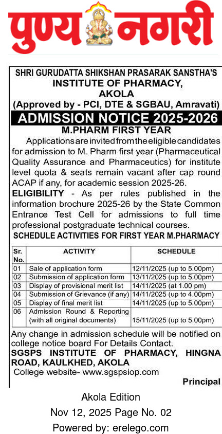 Best Wishes From: Management, Principal, Teaching & Non-teaching Staff, SGSPSIOP, Akola